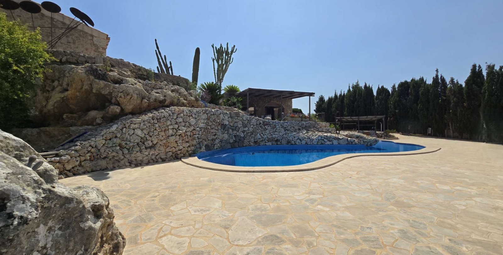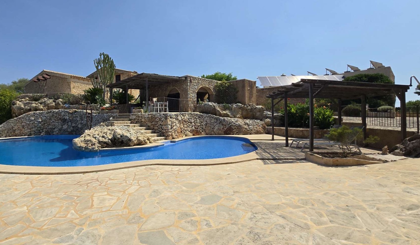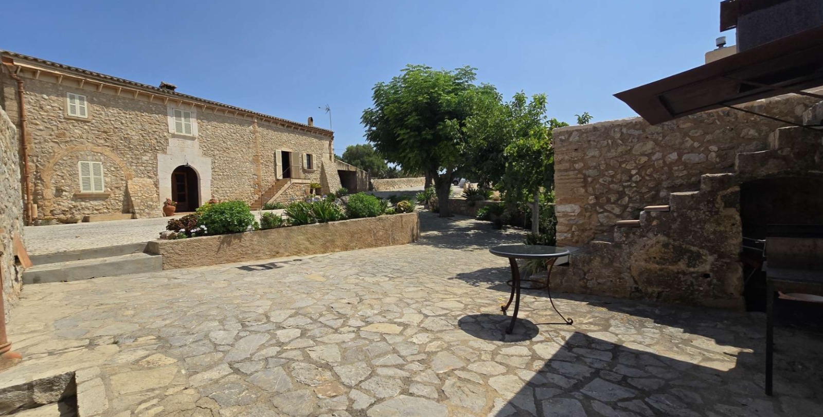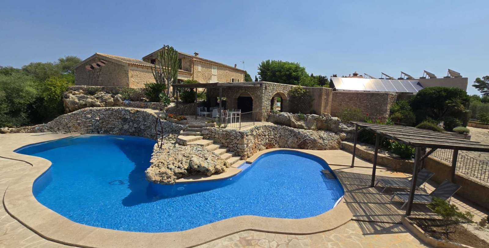 Das Haupthaus strahlt mallorquinischen Charme aus – mit seinen Natursteinmauern, Holzbalken und Details, die Geschichten erzählen. Der Poolbereich fügt sich harmonisch in die Natur ein und bietet offene Ausblicke sowie sonnige Plätze zum Entspannen.