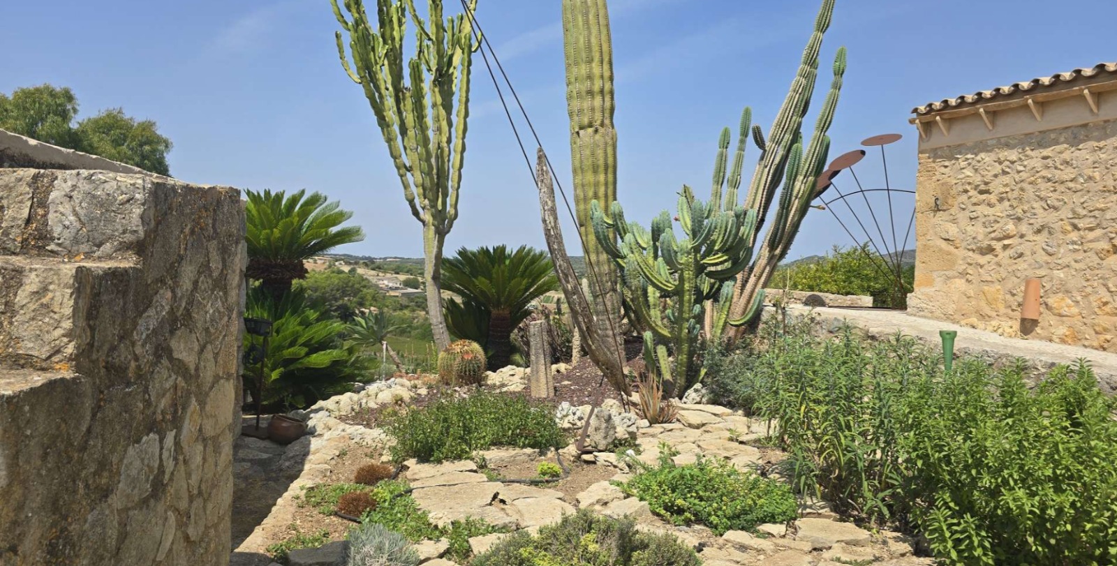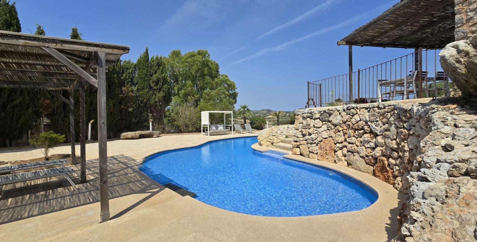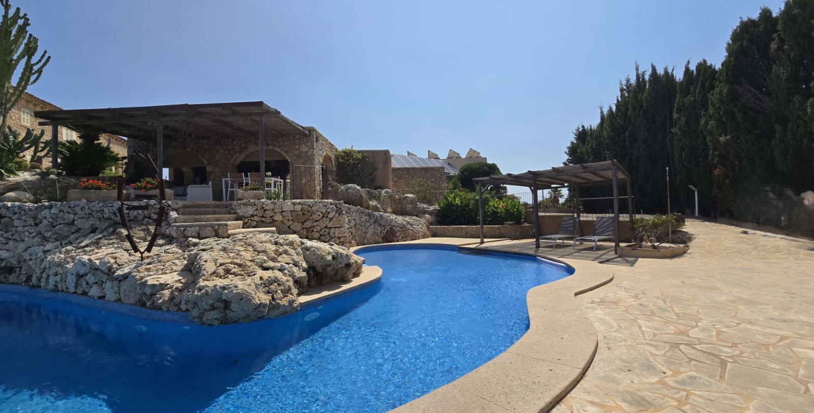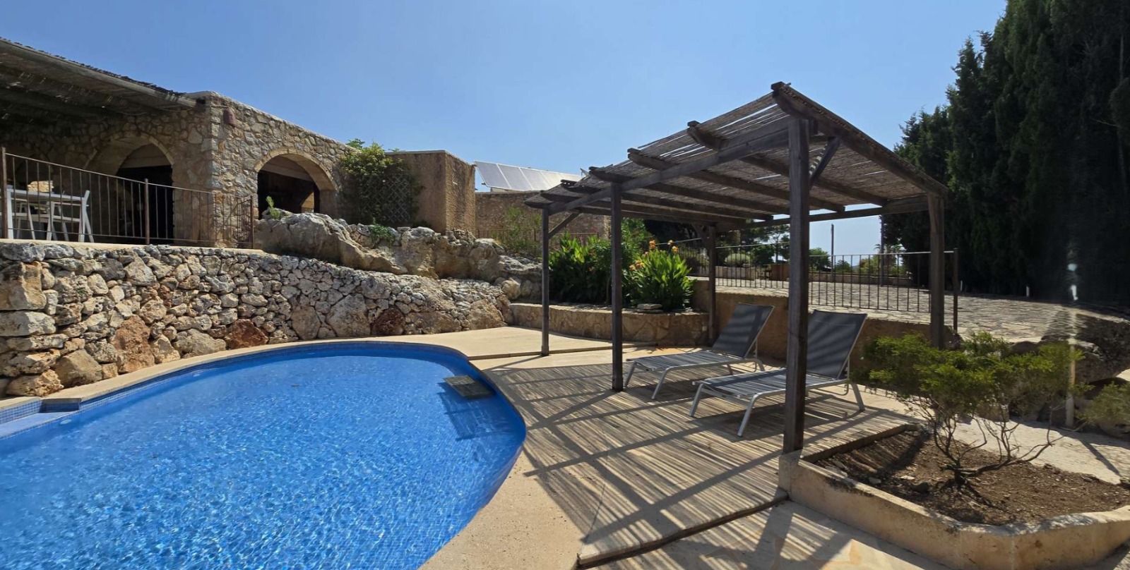 The main house exudes Mallorcan charm with its stone walls, wooden beams, and details that tell stories. The pool area blends harmoniously with nature, offering open views and sunny corners for relaxation.
